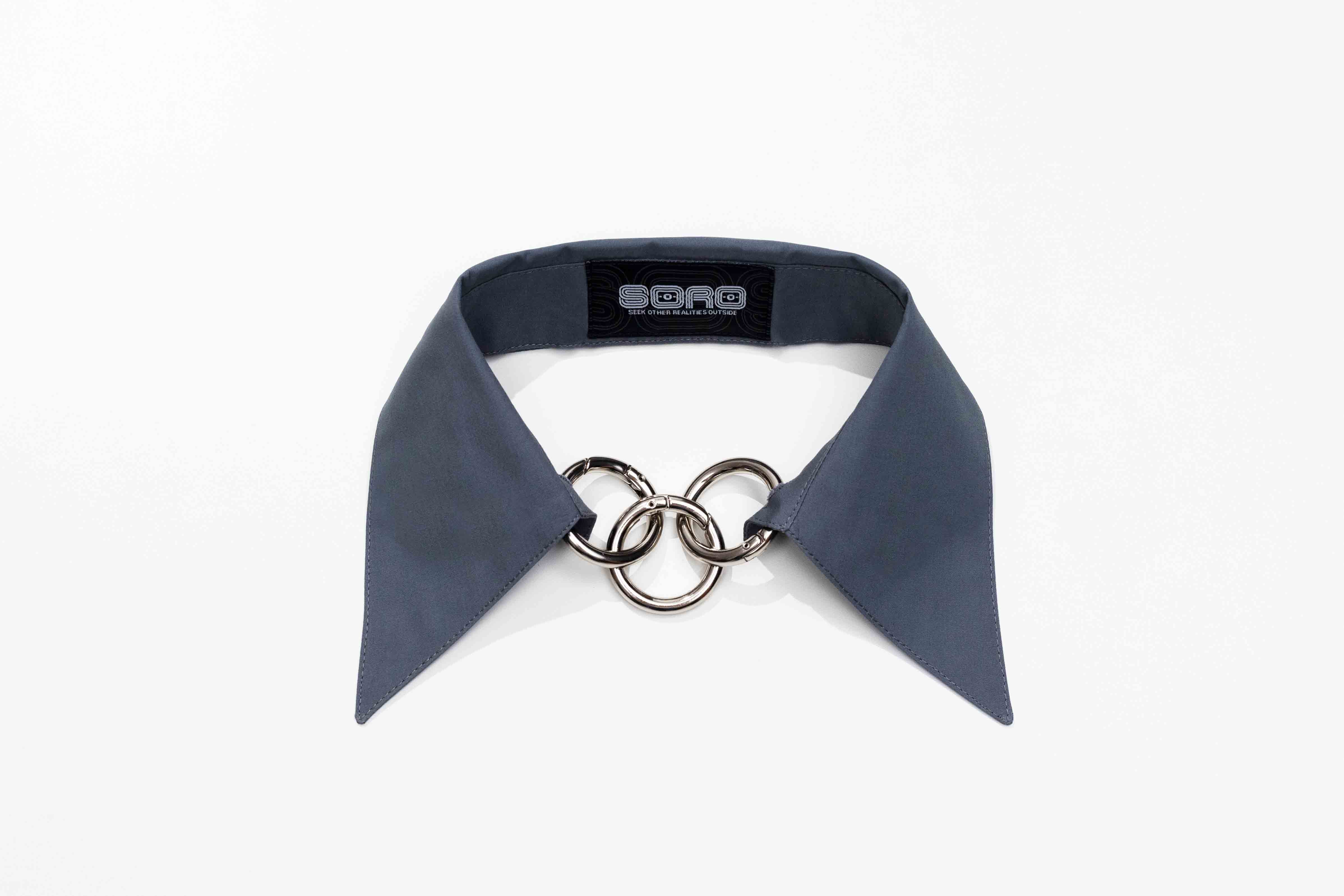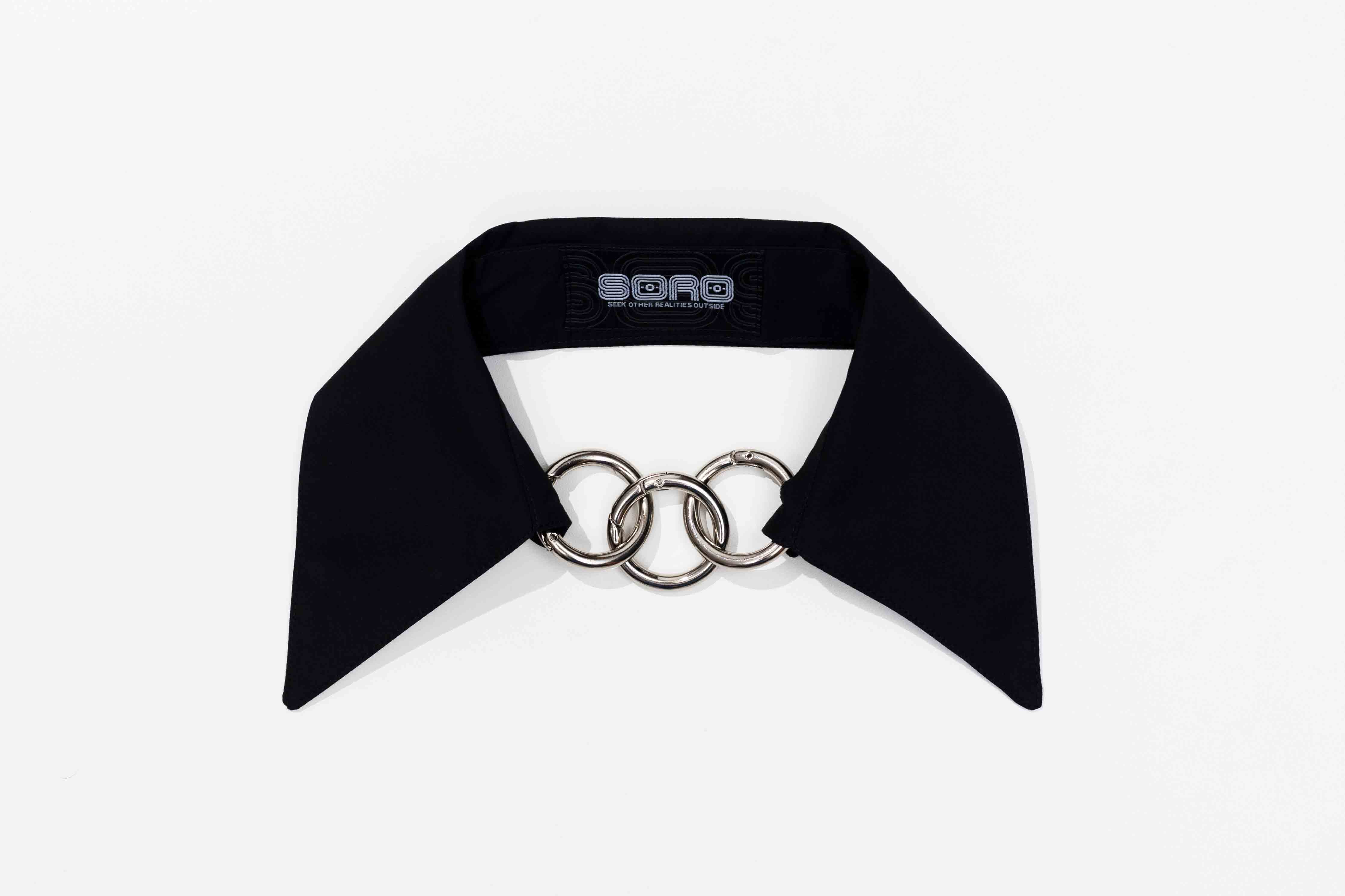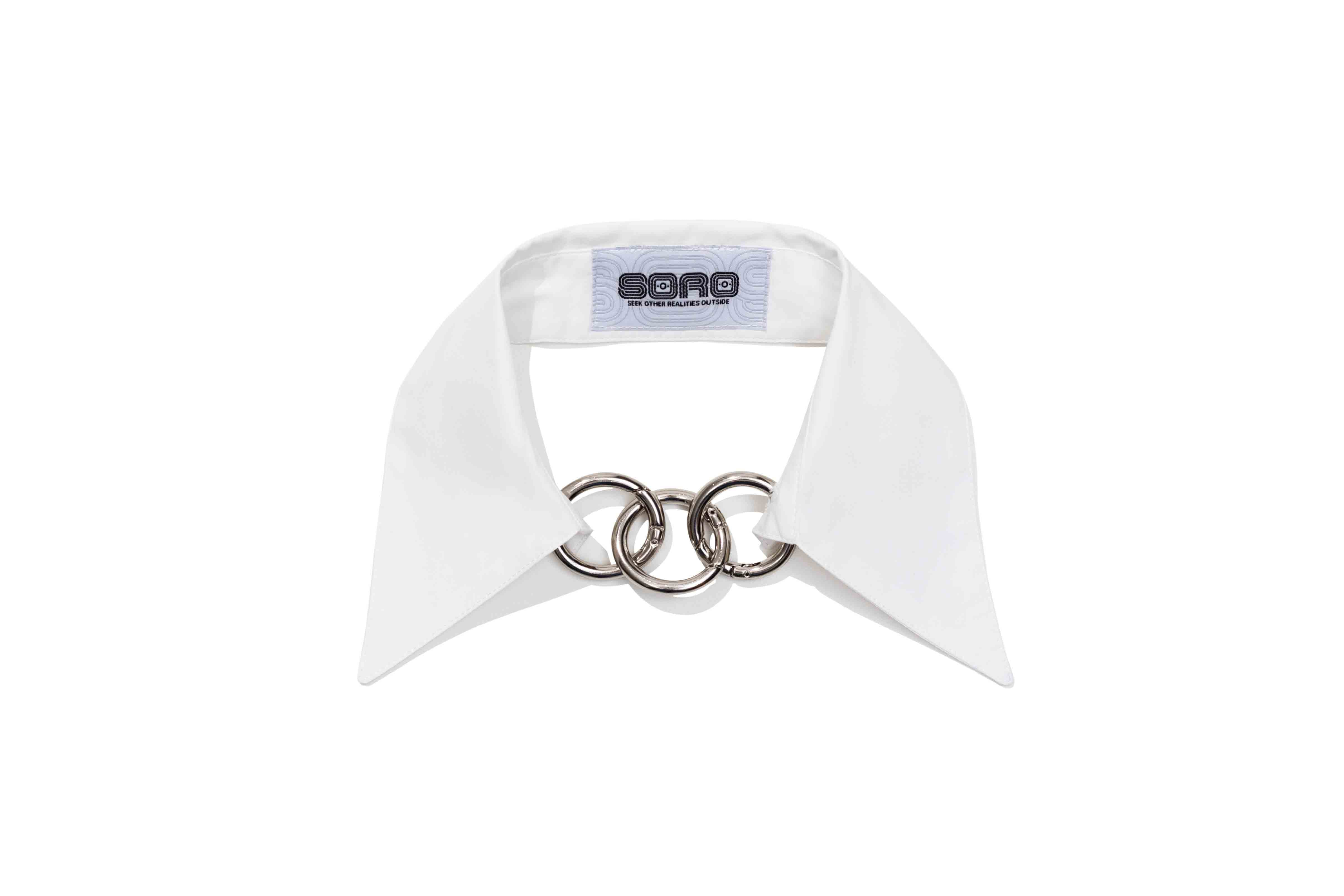 Gola de camisa destacável com fechamento por até três argolas metálicas. Uma peça versátil com um toque conceitual.