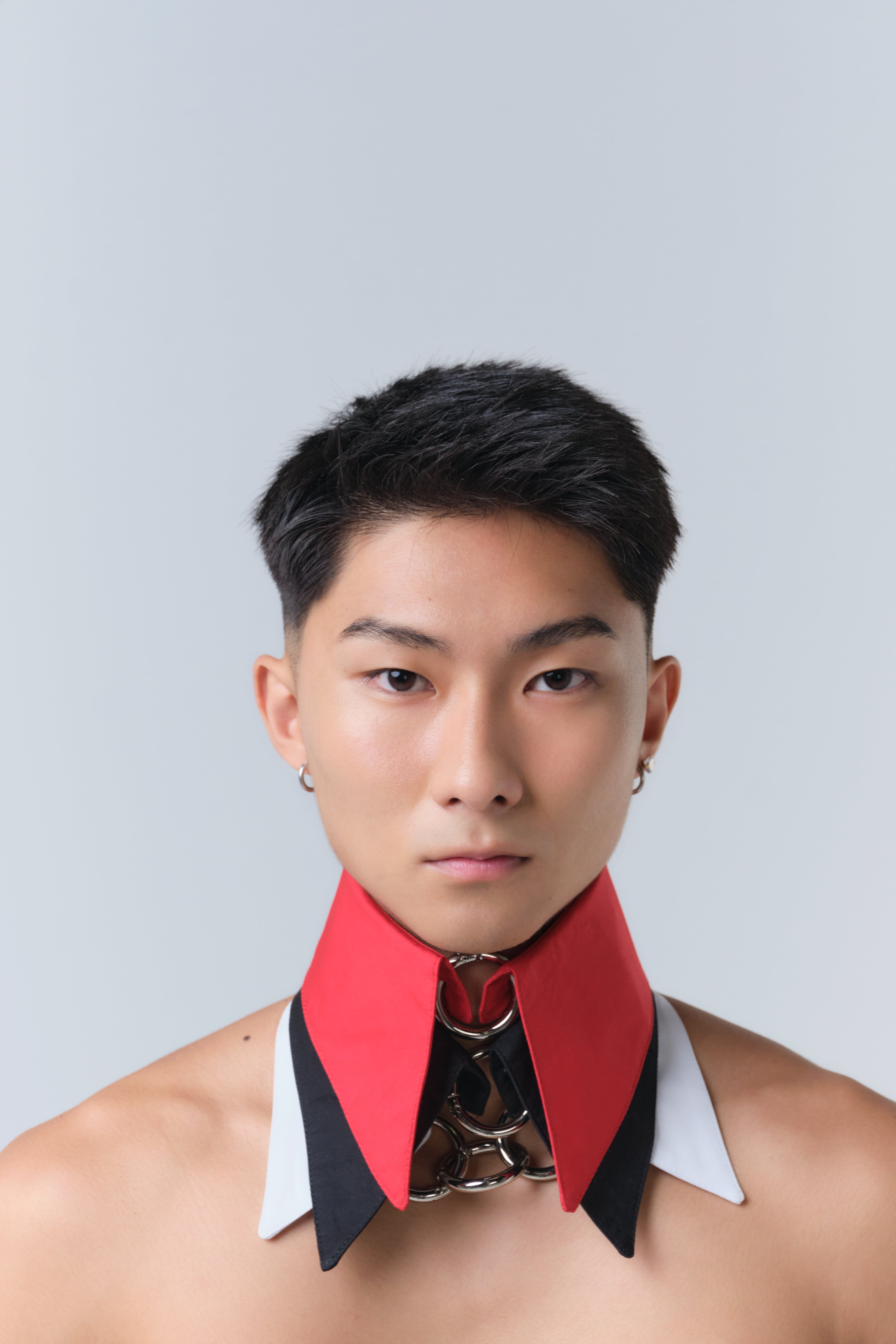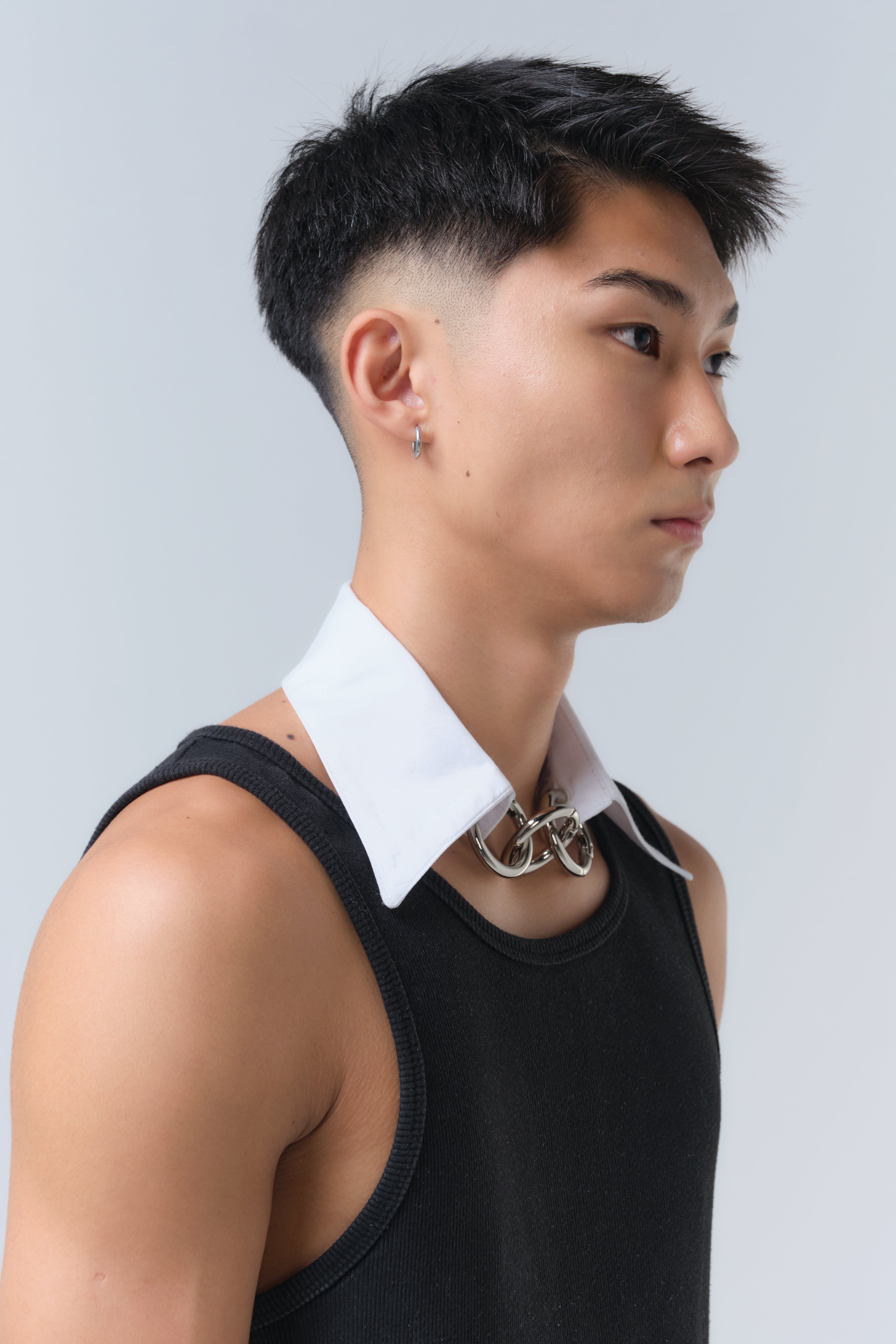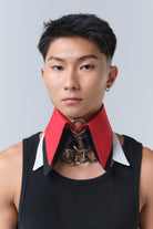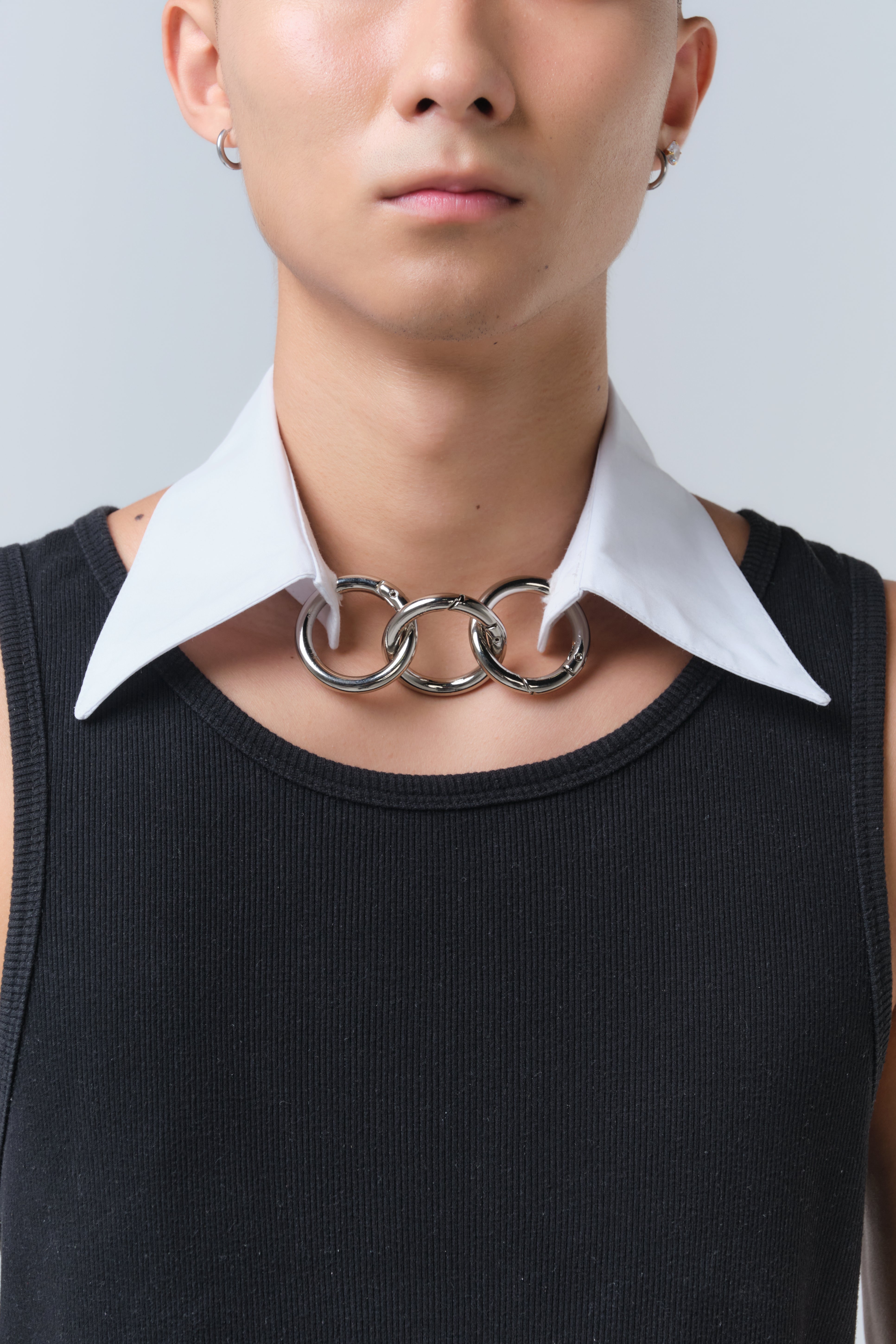 Gola de camisa destacável com fechamento por até três argolas metálicas. Uma peça versátil com um toque conceitual.