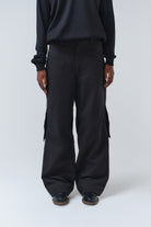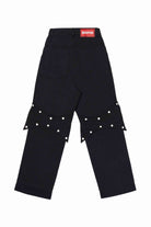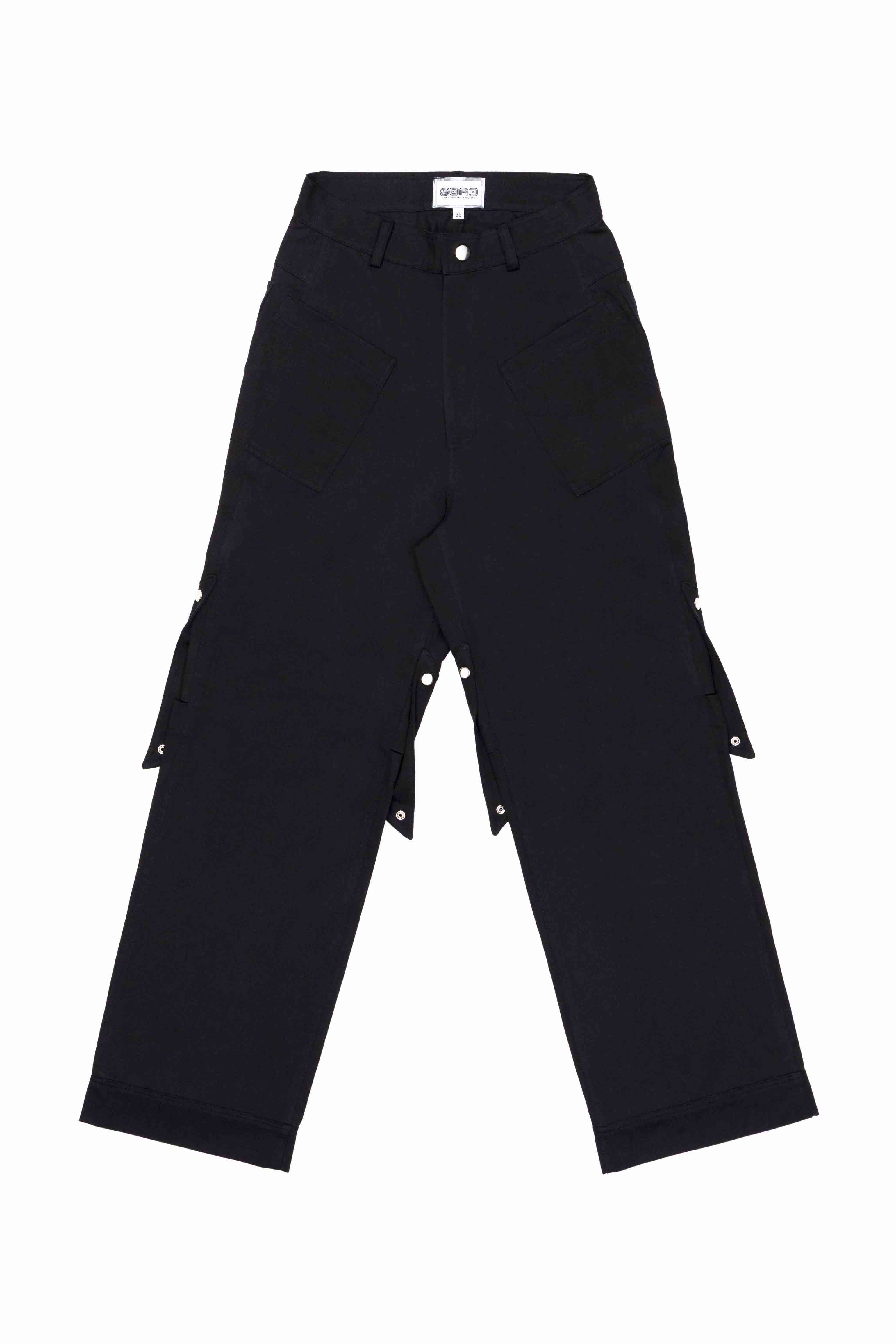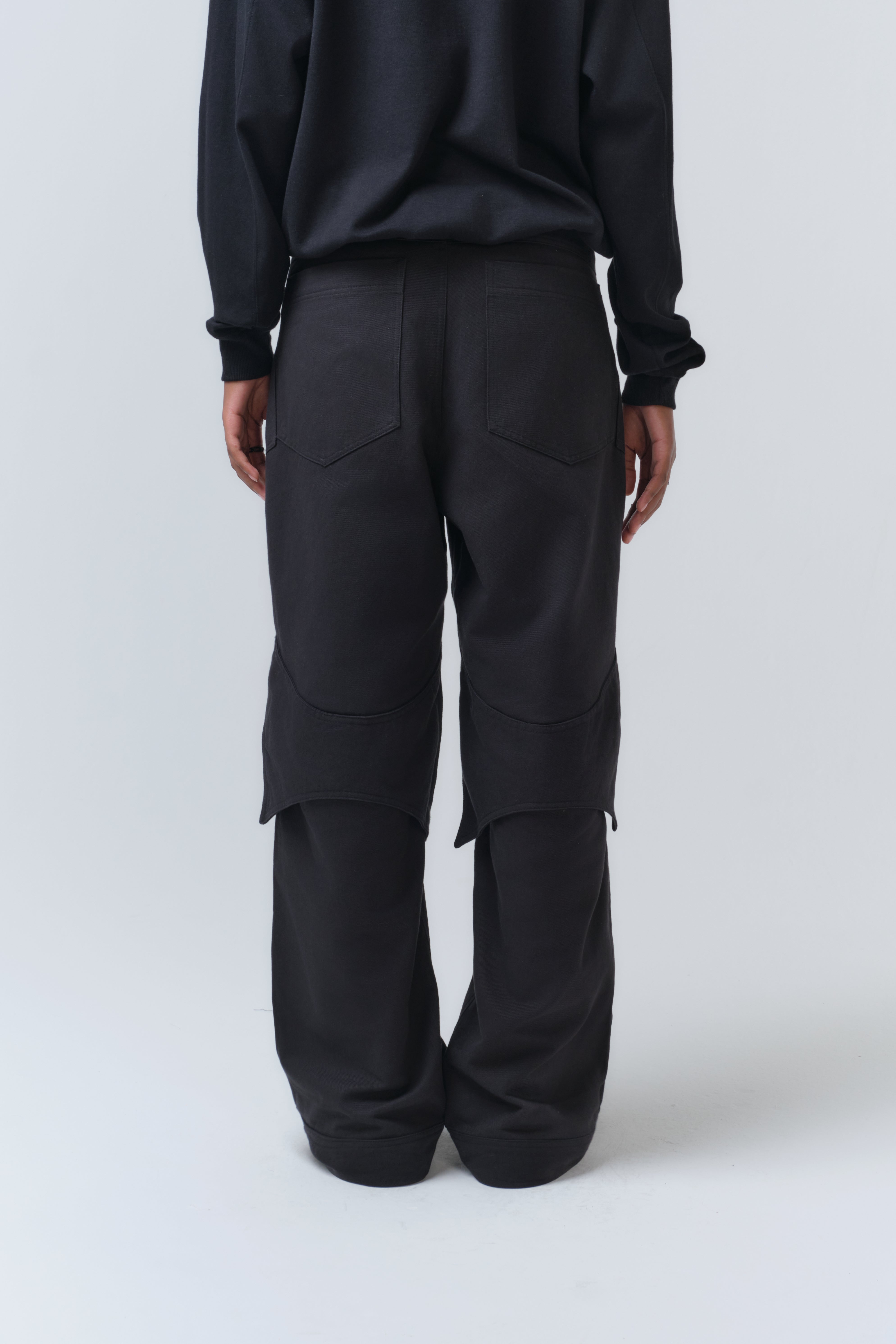 Calça com estrutura reta e solta, cintura tradicional e fechamento por botão e zíper. Os bolsos frontais aplicados em posição invertida criam um ponto focal inusitado, enquanto os detalhes destacáveis na parte posterior ao joelho adicionam originalidade à construção da peça. Possui bolsos traseiros aplicados.