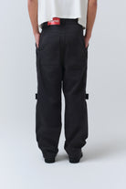 Calça de modelagem reta e cintura alta, com bolsos frontais duplos sobrepostos e bolsos traseiros aplicados no formato tradicional. Possui faixas laterais que vão do cós até a barra, com recorte na altura dos joelhos que destaca o design. Os recortes criam um efeito visual de sobreposição, trazendo identidade e movimento à peça.