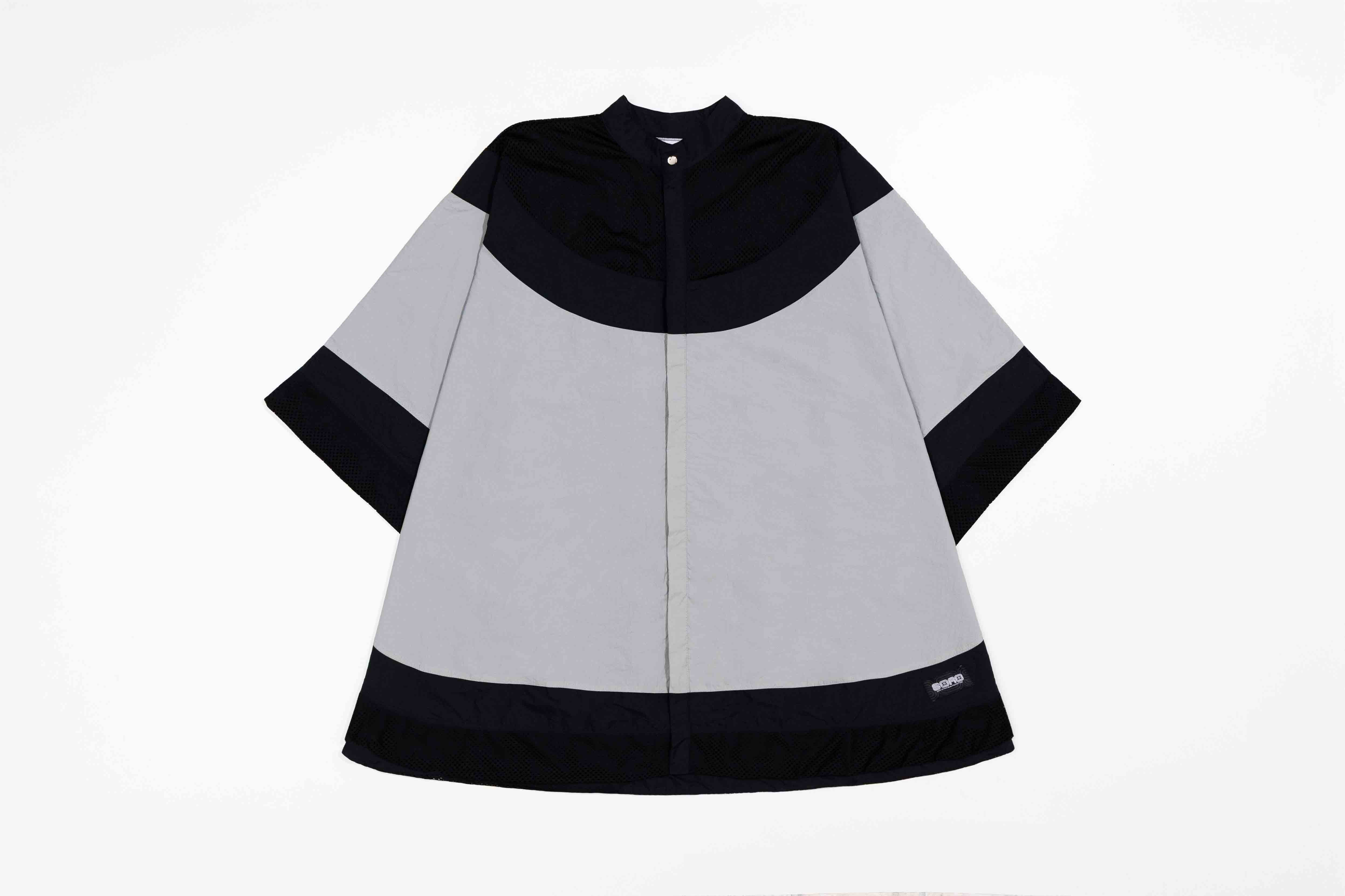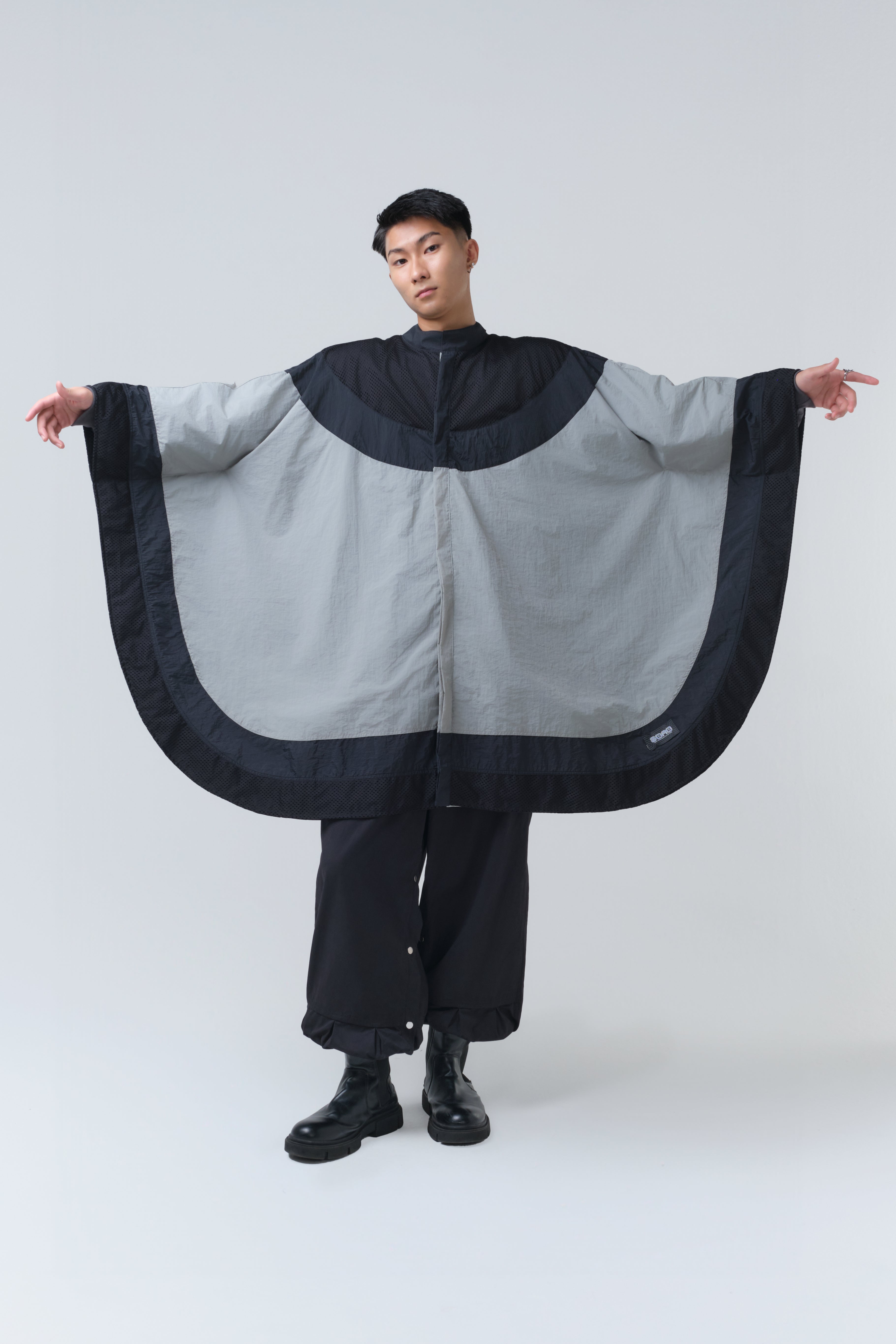 Poncho de silhueta fluída com construção segmentada e visual contemporâneo. Confeccionado em tecido tecnológico de poliamida com detalhes em tela de poliéster, a peça combina leveza e estrutura. Possui suporte nos punhos e gola, além de fechamento frontal por botões. Os recortes em diferentes direções reforçam a estética técnica e modular do design.