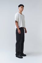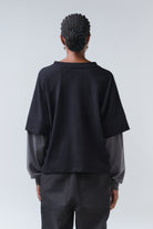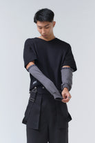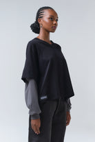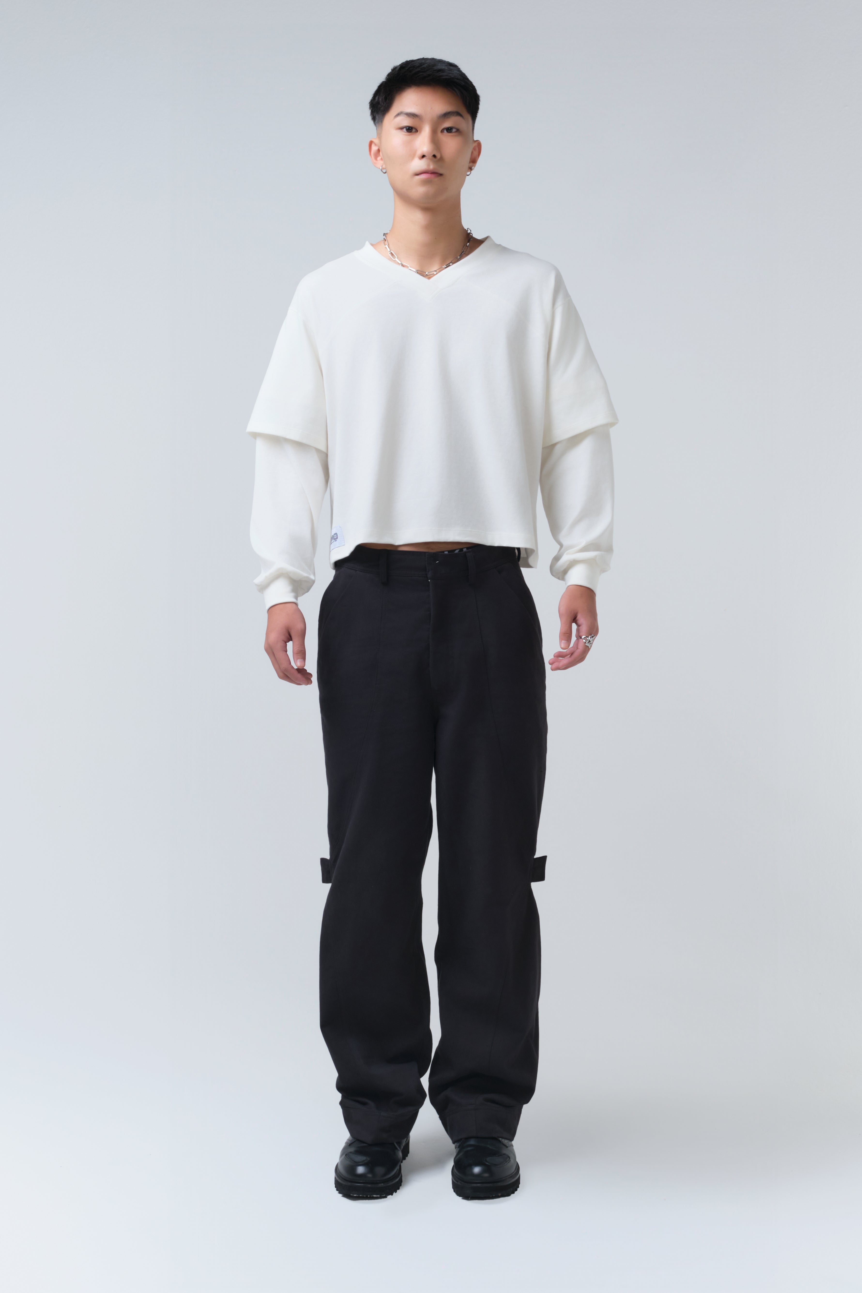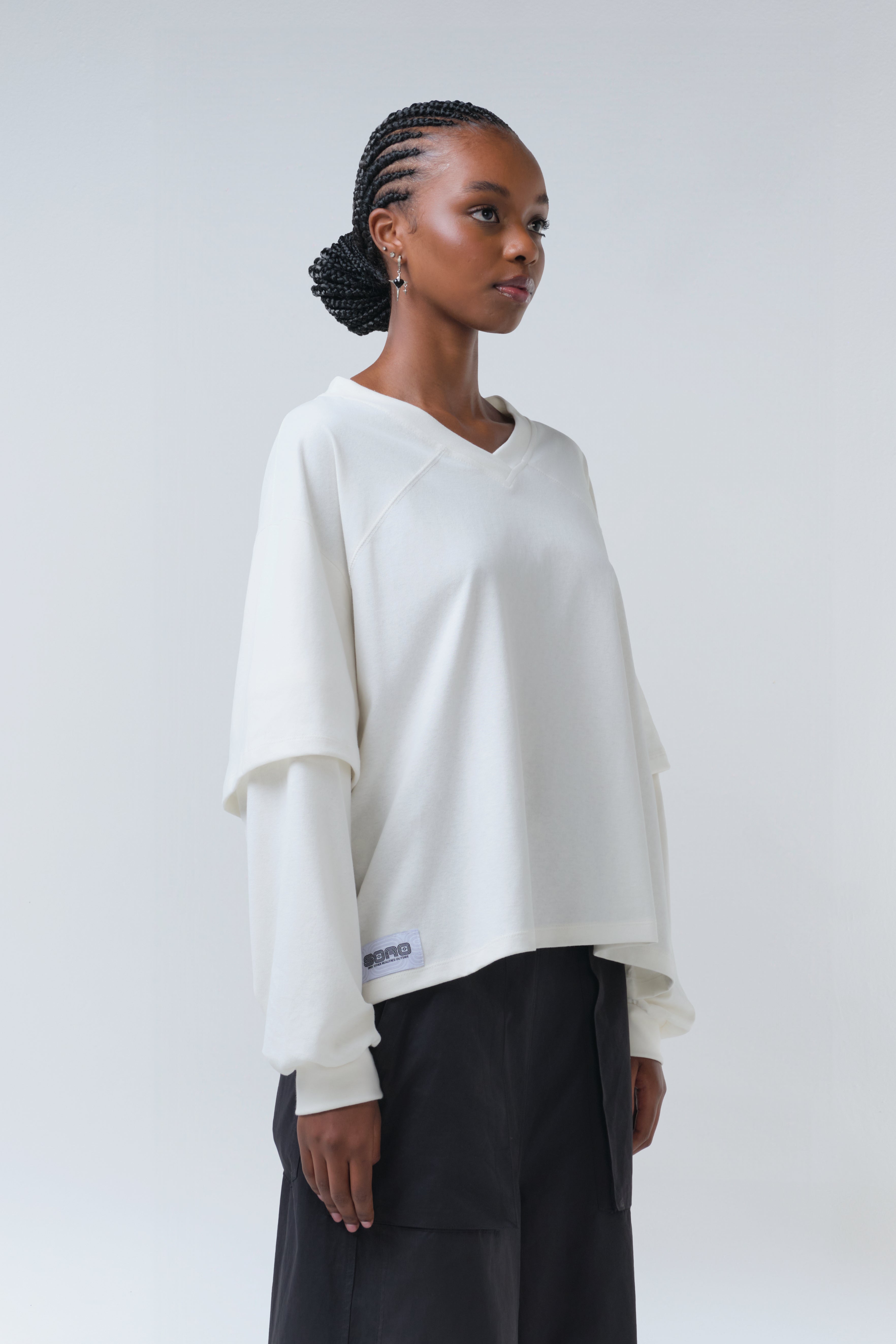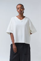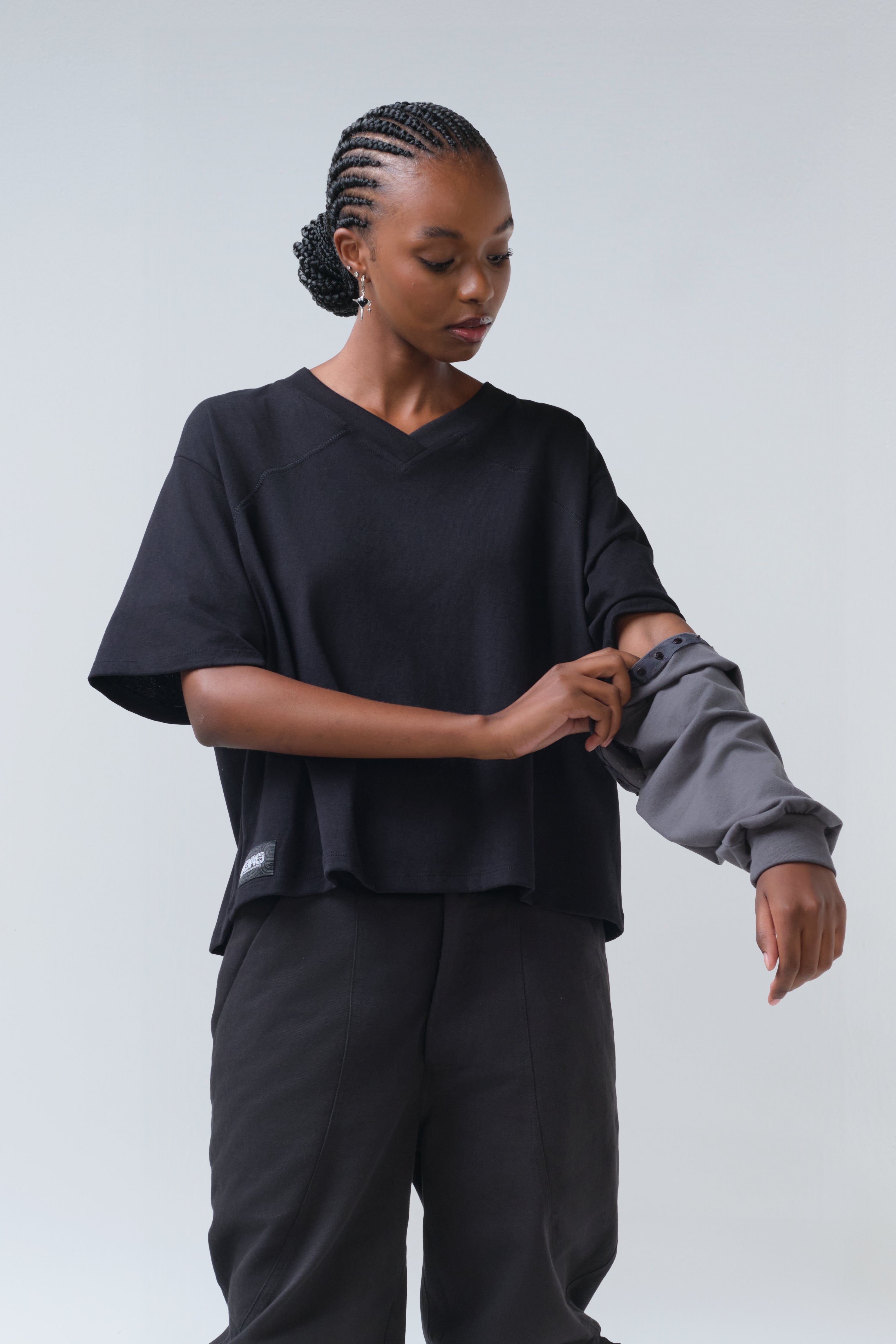 Camiseta cropped em 100% algodão, com gola V ampla e acabamento limpo na barra. As mangas são destacáveis por fita com botões, permitindo versatilidade de uso e adaptação ao estilo ou clima. Disponível em versão inteira off white ou preta com mangas em tom chumbo, para contraste visual sutil.